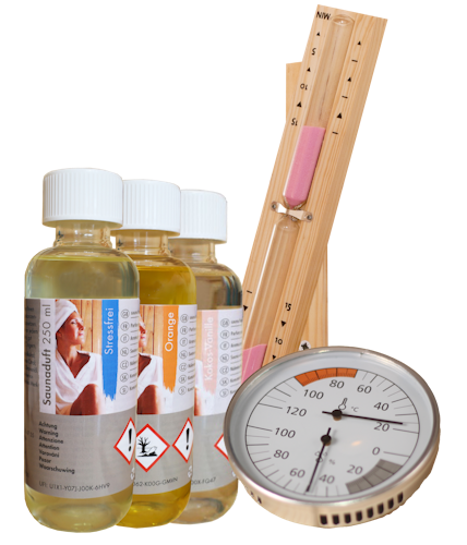 Freuen Sie sich auf: ein Sauna-Klimamessgerät, eine Sanduhr sowie ein Set von drei hochwertigen Saunaaufguss-Konzentraten (Stressfrei, Kokos-Vanille, Orange).