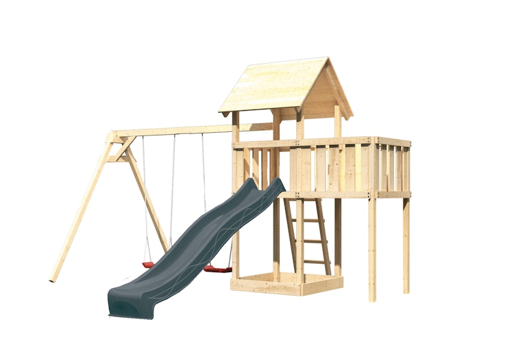 Karibu Akubi Kinderspielturm Lotti mit Satteldach inkl. Wellenrutsche, Doppelschaukelanbau und Anbauplattform