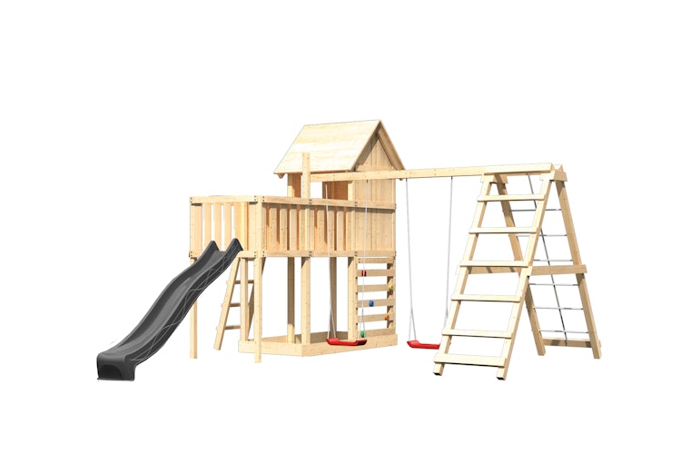 Karibu Akubi Stelzenhaus Frieda mit Wellenrutsche, Doppelschaukelanbau, Klettergerüst, Anbauplattform und Kletterwand