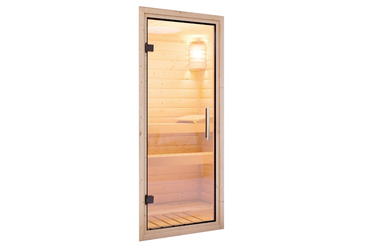 Klarglastür für 68 mm Sauna-Kabinen aus 8 mm Einscheibensicherheitsglas inkl. Türrahmen und Magnetverschluss. Exklusiver Edelstahlgriff (außen) in moderner Optik. Innen aus hochwertigem Holz.